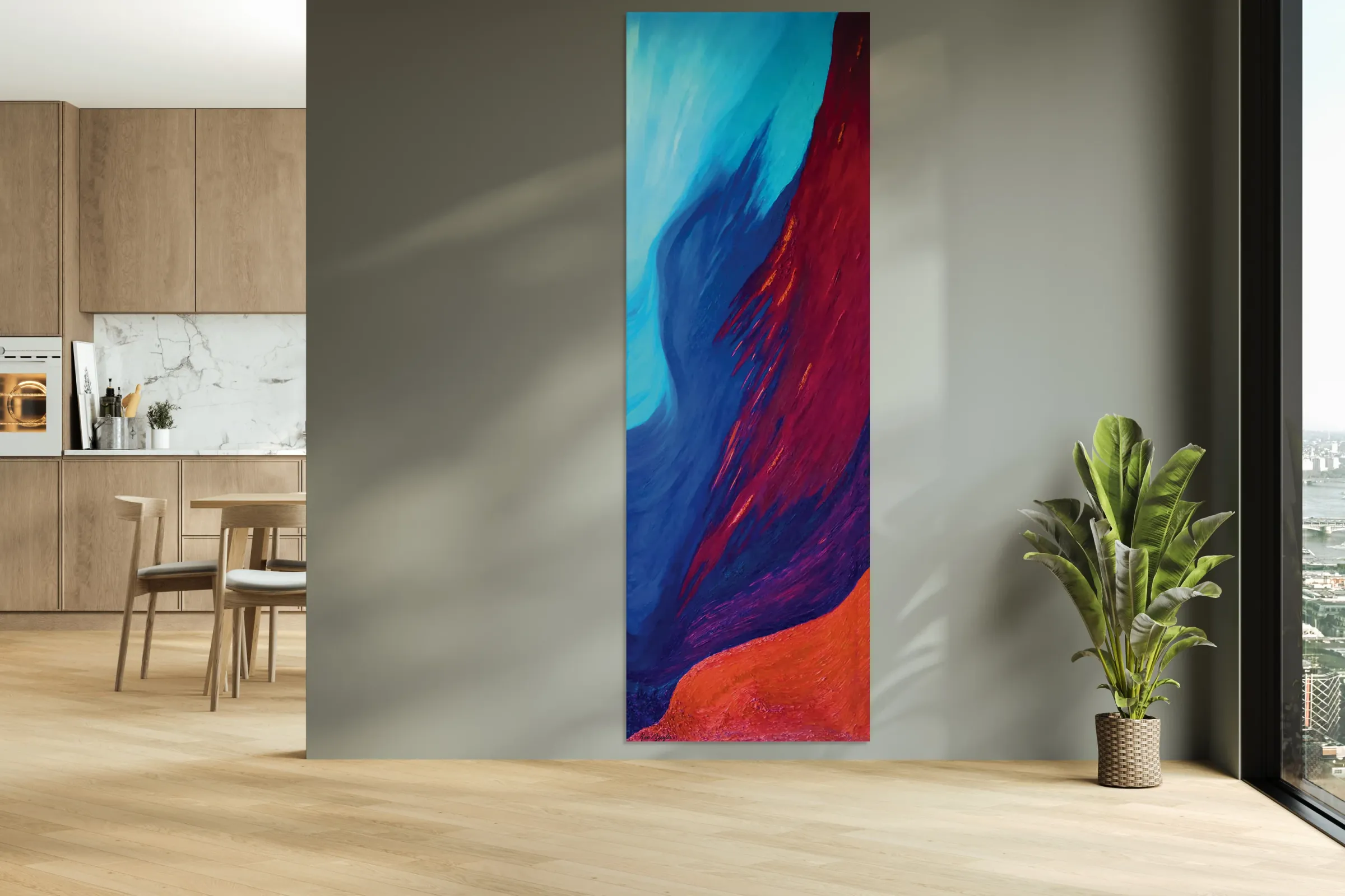 Rising pulls brush rolled, heavily textured oil paint flowing up from copper through violets, reds, blue, sky. Four feet high and sixteen inches wide ...[+]